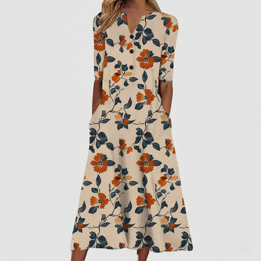 Women's Dress - Floral Print Midi - Half Sleeve - Button Front