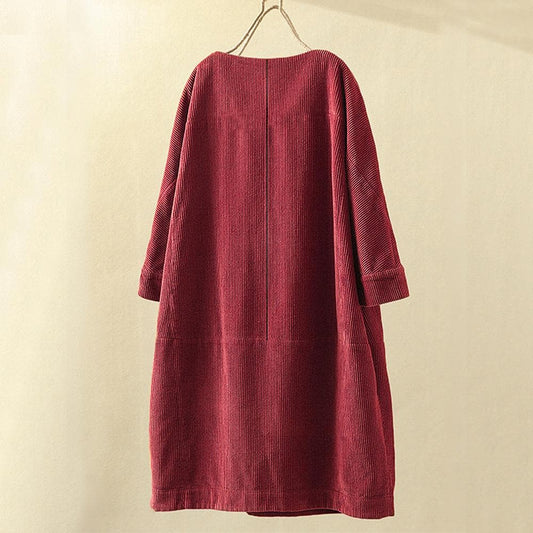 Women Corduroy Dress - Loose Fit - Three-Quarter Sleeves - Soft and Comfortable
