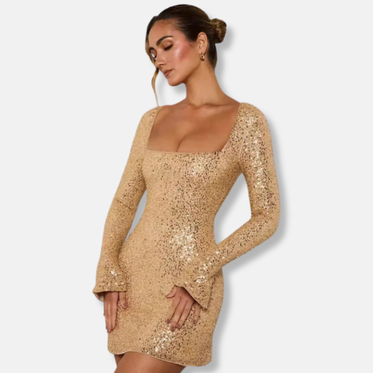 Harper Sequin Embellished Bodycon Mini Dress | Square Neck Long Sleeve Dress