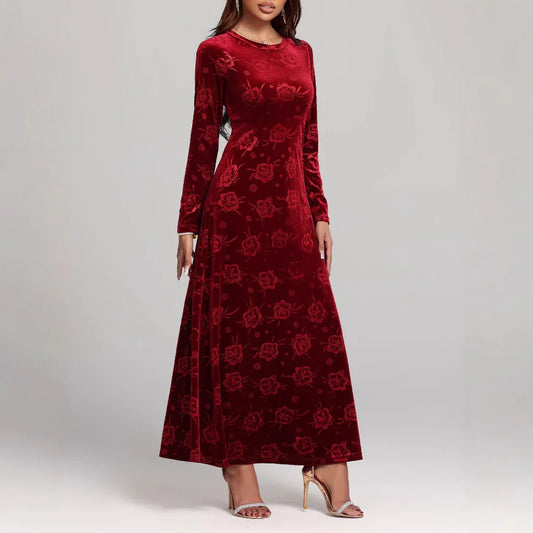 Women's Maxi Dress – A-Line Fit – Velvet with Embossed Flowers – Long Sleeves Elegant