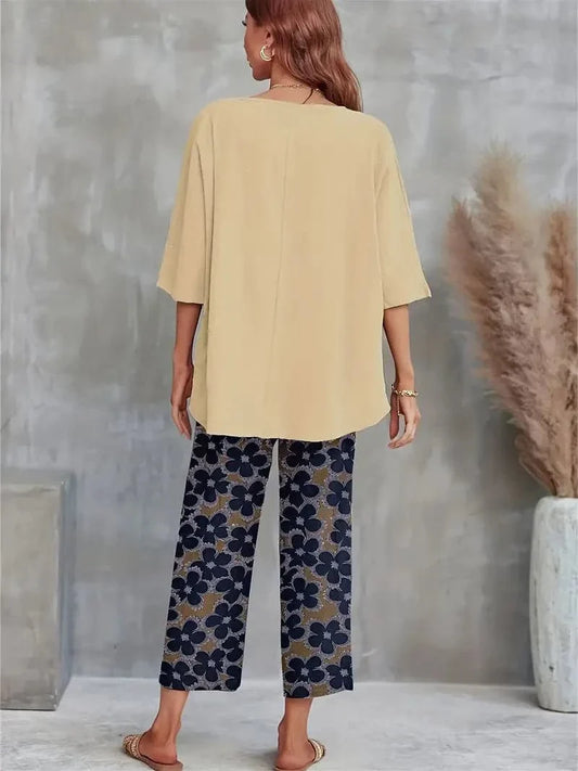 Women's Two-Piece Set - Loose-Fitting Top with Leaf Pattern & Short Sleeves - Ankle-Length Pants with Elastic Waist
