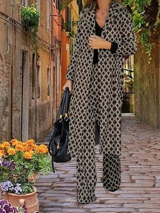 Women's Set - Long Open Coat & Wide Pants - Geometric Pattern - Elegant Fit